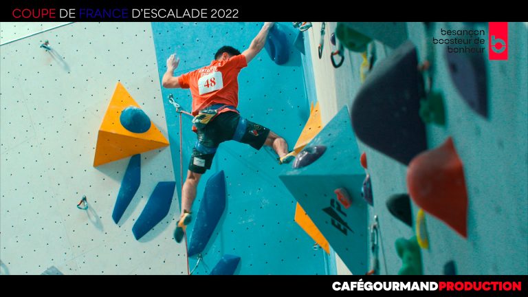 Samedi 12 et dimanche 13 mars 2022, l’association Entre-temps escalade de Besançon a eu l’occasion de recevoir de nombreux grimpeurs français, dans le cadre de la Coupe de France d’escalade 2022. Pour satisfaire notre commanditaire Terre de Champio.ne.s Besançon, nous avons travaillé en collaboration avec deux autres agences bisontines, Digital Deluxe et 53x11 studio. Concernant Café Gourmand Production, nous avons suivis plusieurs grimpeurs dans le but de crée une vidéo représentative de cette évènement sportif se déroulant dans notre ville.
